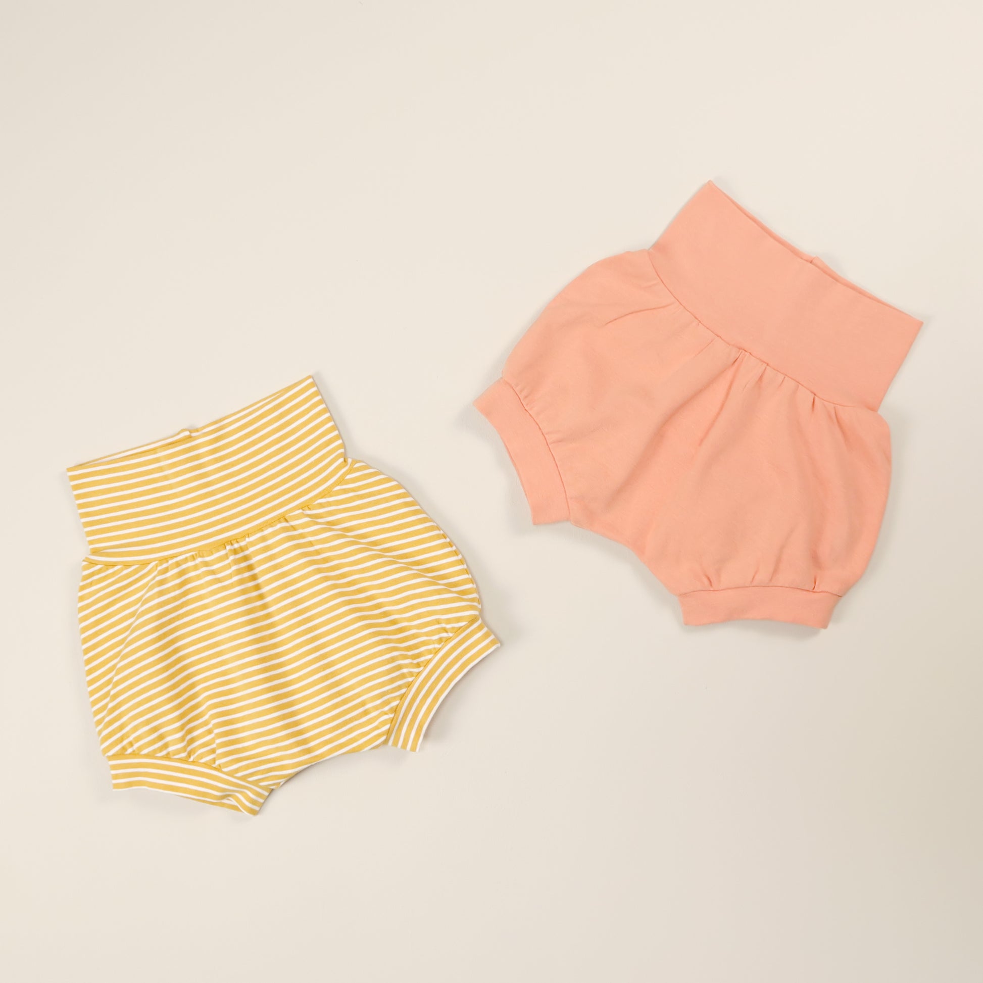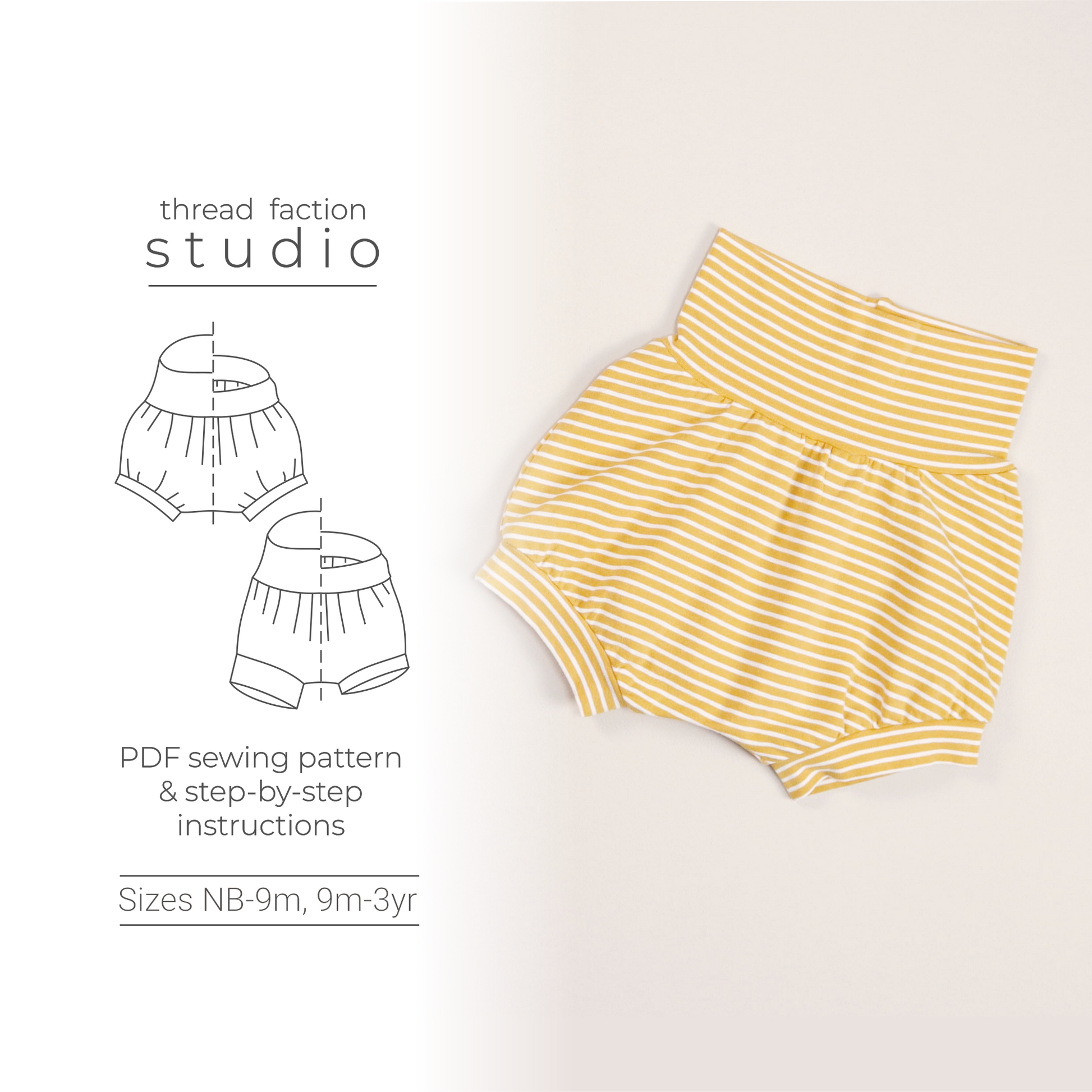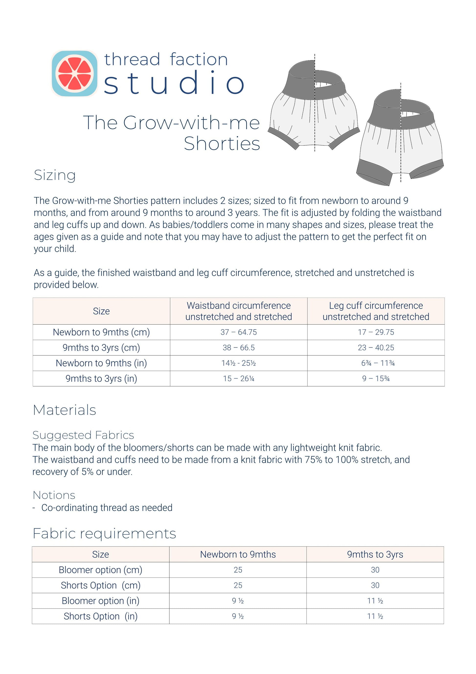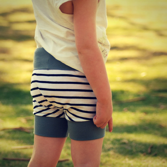 The Thread Faction Grow-with-me Shorties is a PDF sewing pattern for one size fits most baby and toddler bloomers or shorts designed with the cloth nappy bottom in mind. They are made with a stretch waist and cuffs to accommodate a large range of waist and leg sizes. The fit is adjusted by folding the waistband and leg cuffs up and down as required. 2 sizes are included in this pattern: newborn to 9mths, and 9mths to 3yrs.