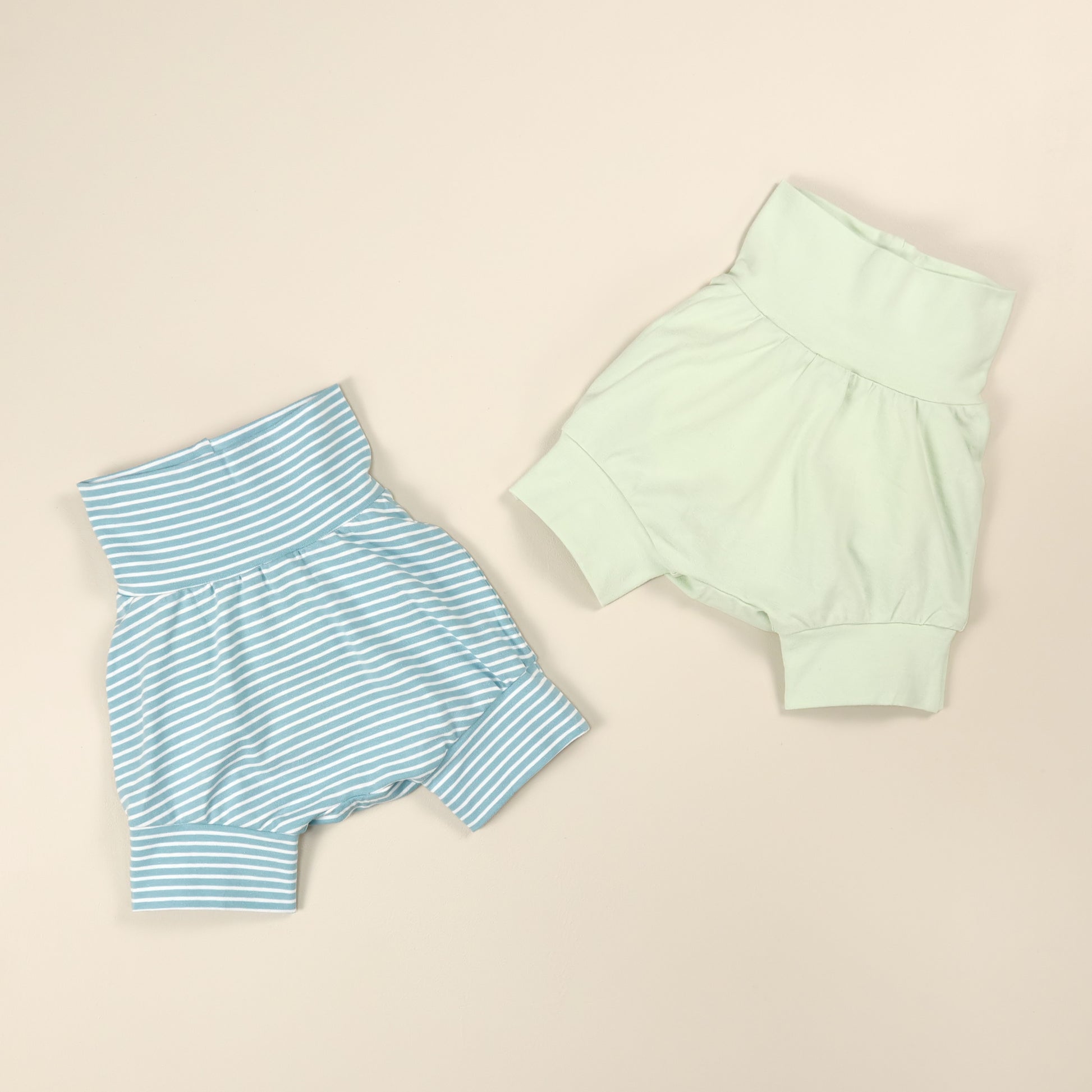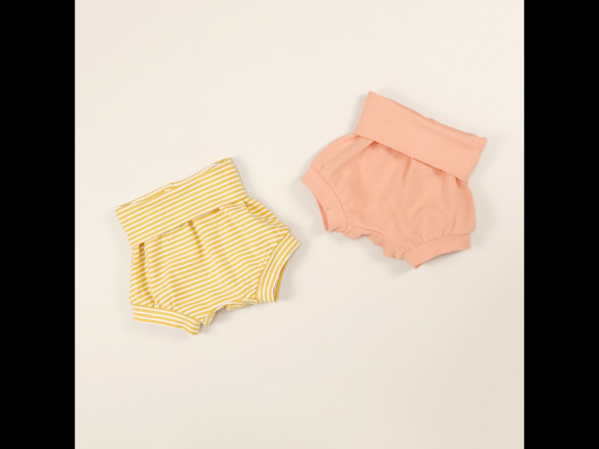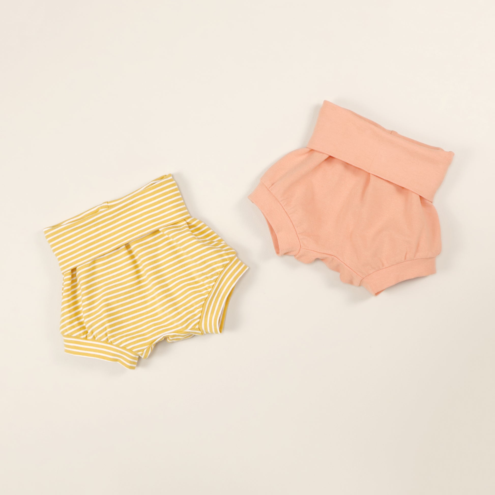 The Thread Faction Grow-with-me Shorties is a PDF sewing pattern for one size fits most baby and toddler bloomers or shorts designed with the cloth nappy bottom in mind. They are made with a stretch waist and cuffs to accommodate a large range of waist and leg sizes. The fit is adjusted by folding the waistband and leg cuffs up and down as required. 2 sizes are included in this pattern: newborn to 9mths, and 9mths to 3yrs.