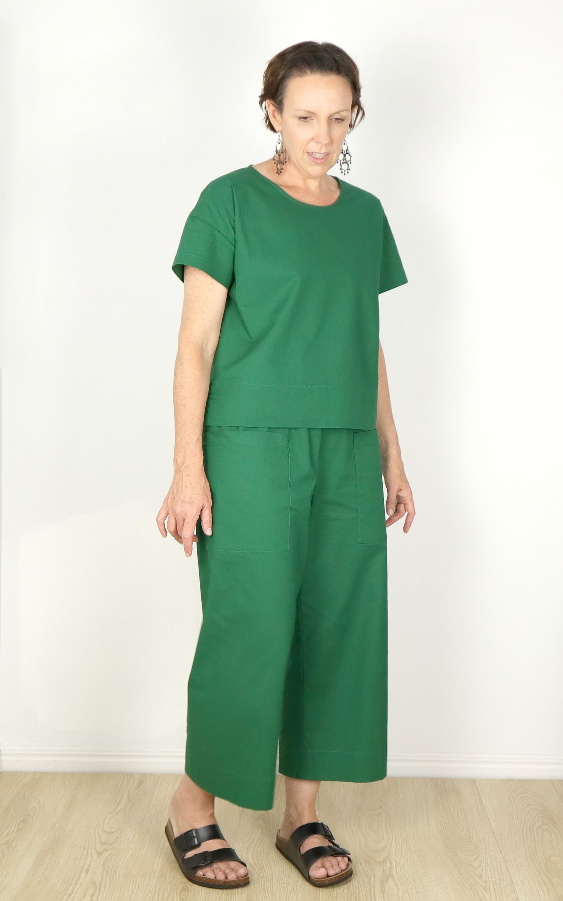Our model is wearing the Lake woven t-shirt with our Lake woven pants. The the Lake woven pant pattern is not included in this listing but is available in our store separately or in a bundle deal with the Lake woven t-shirt (also listed in the store seperately).
